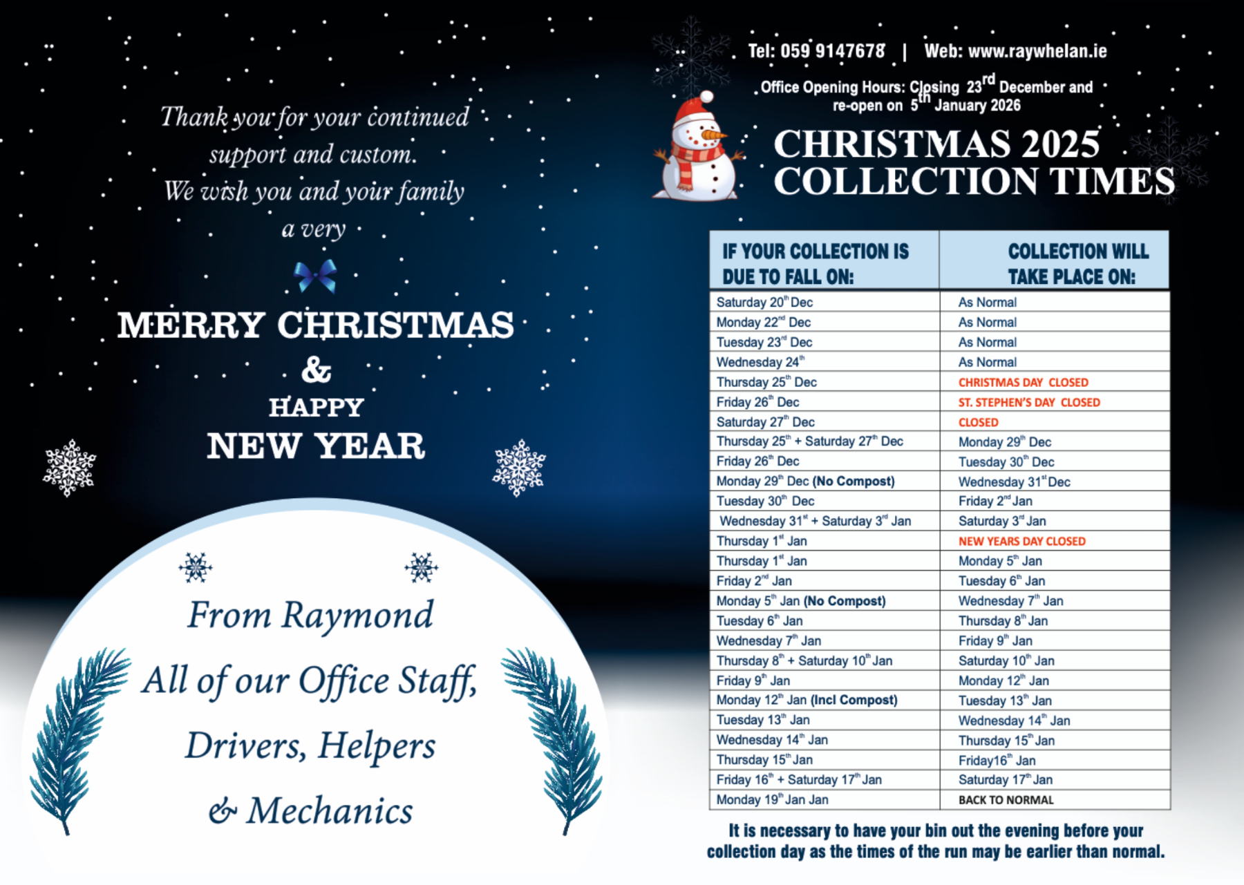 Ray Whelan is Carlow’s leading Skip Hire and waste dispostal company since 1978. As a thriving local family business, we strive for perfection with our fast, efficient and reliable service.